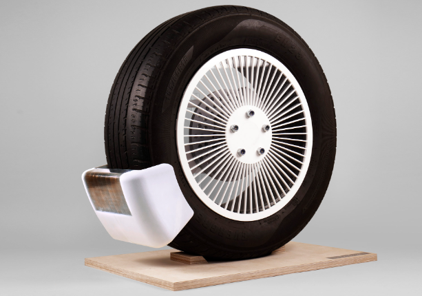 the pinnacle of eco-material design showcased in the exhibition came from ‘The Tyre Collective’, a team prototyping a rear wheel mounted product tasked with collecting the pollution produced by vehicle’s tyre wear. As well as this, a range of materials produced with the rubber by-product had been displayed, all with varying properties and potential applications.
